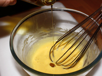 Con unas varillas metálicas batimos continuamente mientras incorporamos el aceite, poco a poco, dejándolo caer en un hilo fino.