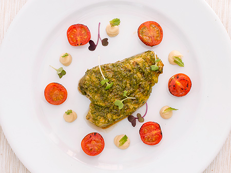 Servimos el bonito con los tomatitos asados y unos puntos de hummus, como se muestra en la imagen.
