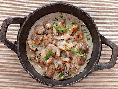 Incorporamos los champiñones, 2 ramitas de tomillo (solo las hojas), un chorrito de brandy, 100 ml de nata y una pizca de sal.